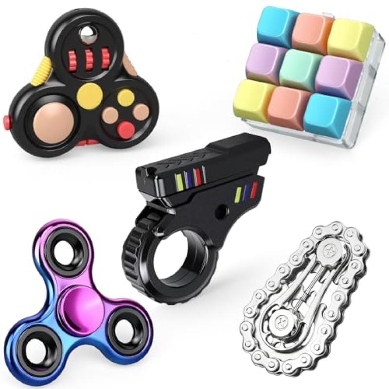 - 5 unique fidget toys – including a spinner, cube, bike, and chain, each with different tactile features