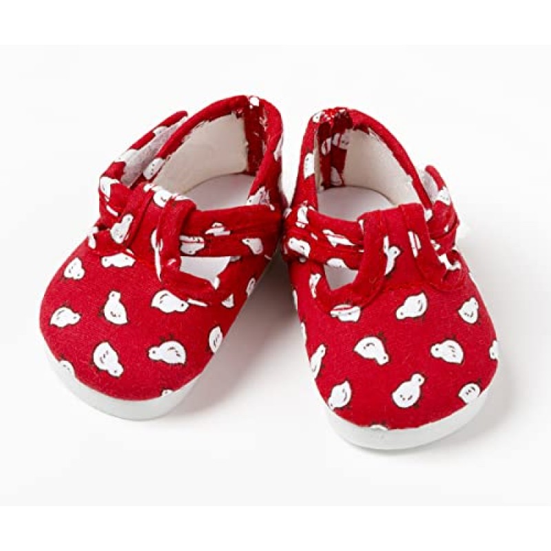 Add a touch of charm to your doll's outfit with these adorable Dolly Doodle Shoes from Frilly Lily! These miniature fabric shoes feature a red fabric adorned with cute white chicks and a velcro closure. The T-bar design perfectly complements a variety of outfits available from Frilly Lily. Measuring 6x3.5 cm, these shoes are compatible with 43 cm dolls like Baby Born. Don't forget to check out the matching dresses and rompers for a complete look!