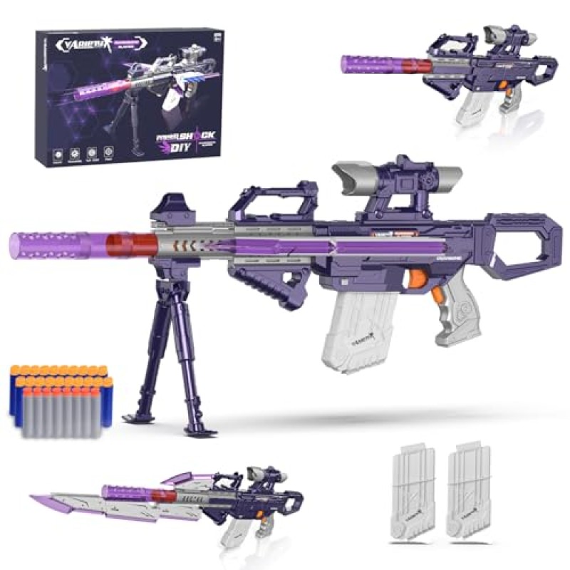 Unleash your creativity with the Kamaso Nerf Sniper Rifle Automatic Toy Gun! This versatile toy offers over 100 possible combinations, allowing children to design their dream toy gun. Made from high-quality materials, it ensures durability during intense play. Shoot darts up to 50 feet with fast and accurate shots for a competitive edge. The set includes 2 magazines, 50 bullets, and a rechargeable battery for extended playtime. Perfect for boys and girls aged 6 and up, this toy gun is an excellent gift for FPS game enthusiasts!