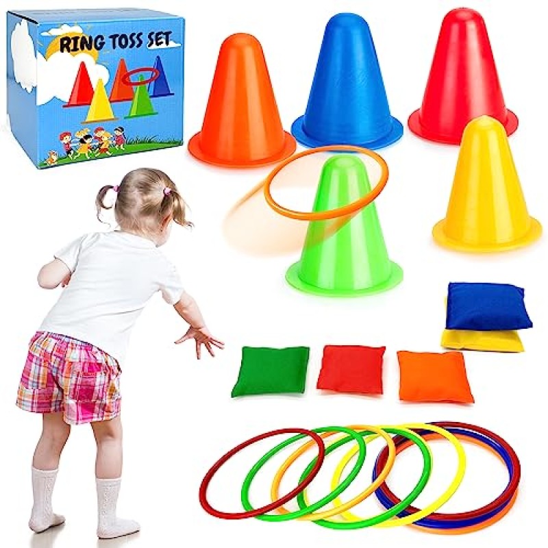 Get ready for a whirlwind of fun with this colourful 3-in-1 ring toss and bean bag game set, perfect for little hands and big imaginations! Whether played indoors or outside in the garden, this set invites children to improve their motor skills, hand-eye coordination, and concentration through joyful play. Brightly hued rings, mini cones, and soft bean bags make every toss a delightful challenge that sparks teamwork and friendly competition.
