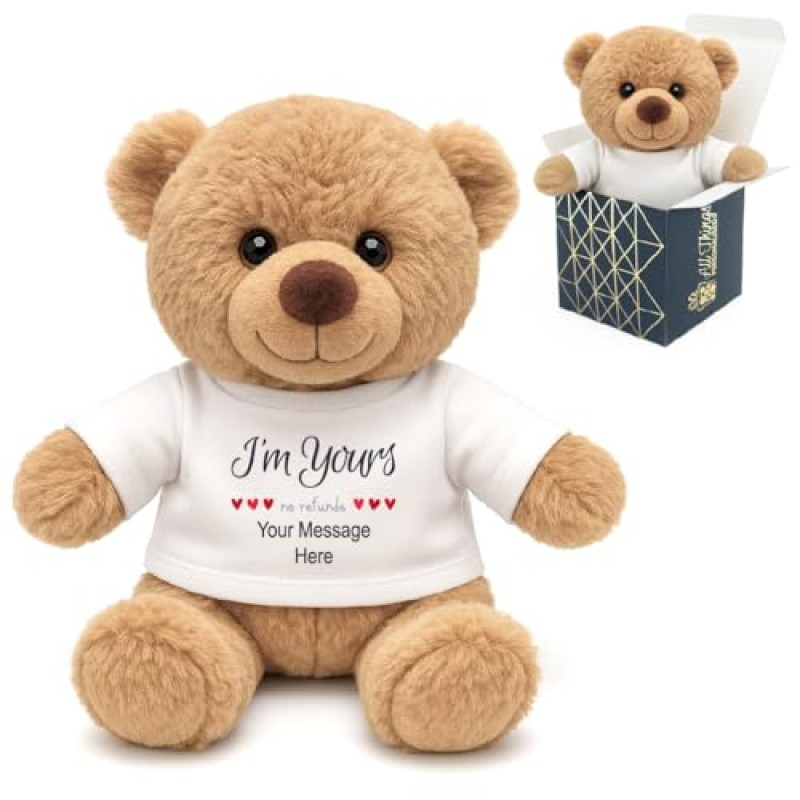 Bring a cuddle companion to life with this delightful personalised teddy bear, perfect for sharing sweet sentiments on anniversaries, Valentine’s Day, or just because! Standing approximately 8 inches tall, this soft teddy can be customised with your own heartfelt message permanently printed on its removable t-shirt – a charming way to say “I’m yours” with a playful twist.